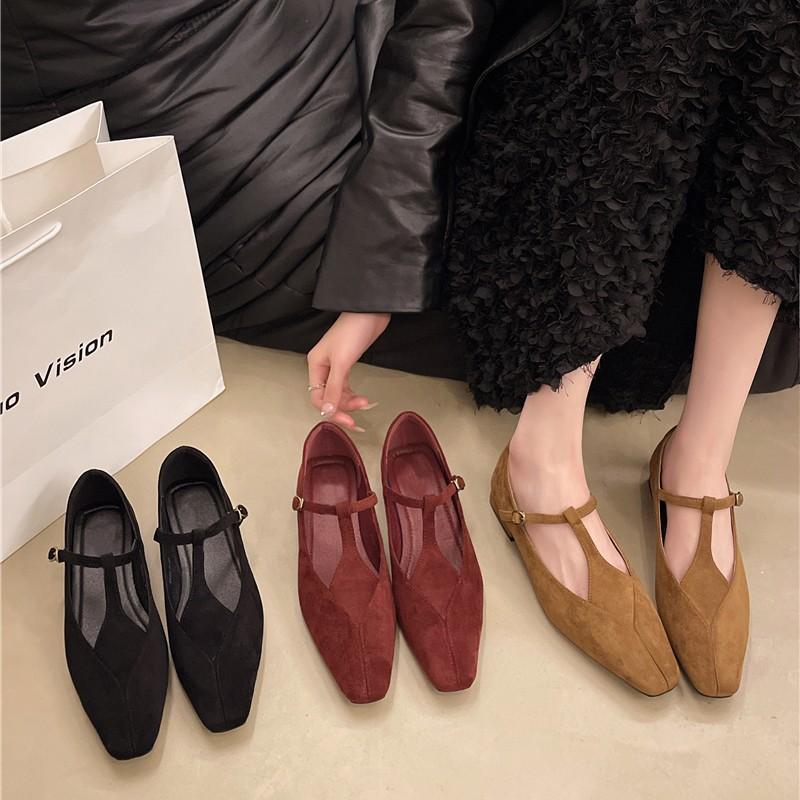 French small square head retro thick heel suede single shoes women's autumn design buckle Mary Jane shoes