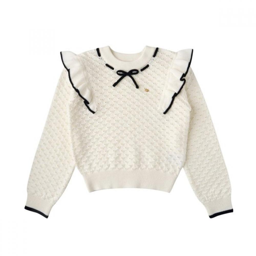 The Roozpe Ribbon Shoulder Frill Knit (76119-300-01) is a toddler sweater characterized by its loose fit, cute ribbons, and shoulder frill designs. It offers a soft wearing experience and warmth, making it suitable for everyday wear as a top.