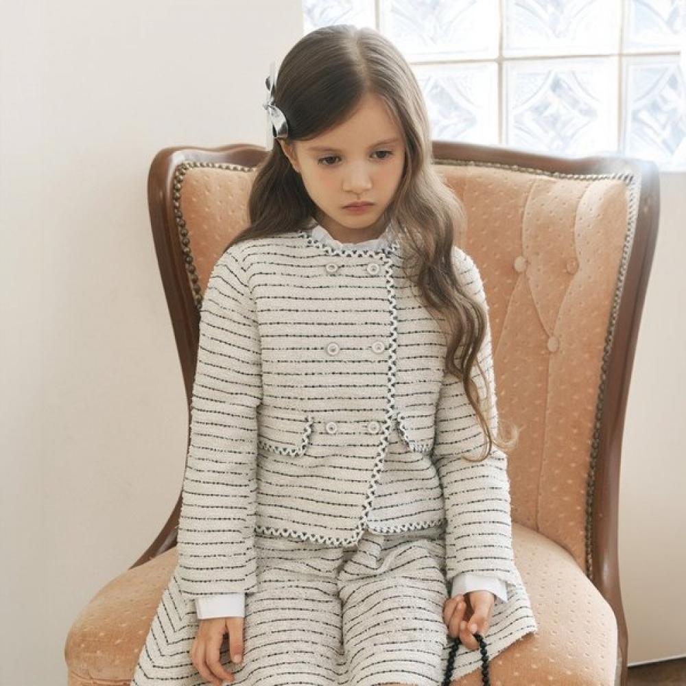 Loose Pay Stripe Tweed JK (76119-120-02) is a tweed jacket featuring elegant black and ivory stripe patterns. It is crafted with a semi-double design, giving it a luxurious and sophisticated feel, highlighted by the black sequin embellishment on the ribbon part.