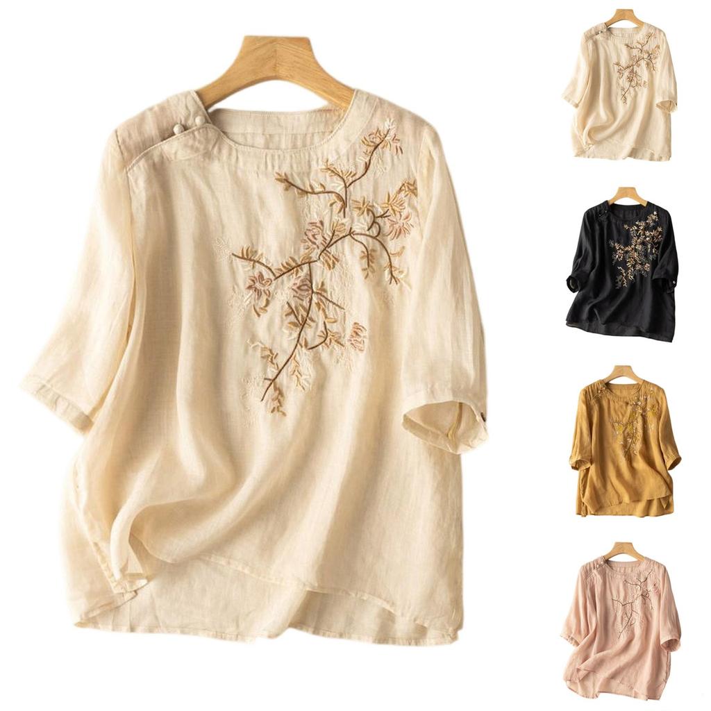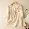 Women's Vintage Inspired Loose Fit Mid-Sleeve Cotton Linen Blend Embroidered Top