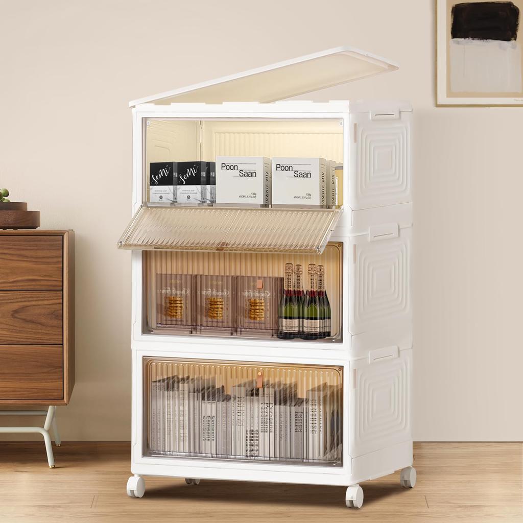 Home Bliss Storage Box with Lid, Stackable, Foldable, Front-Opening Magnetic Door with Casters, Multifunctional, Easy Assembly, Transparent, Stylish,