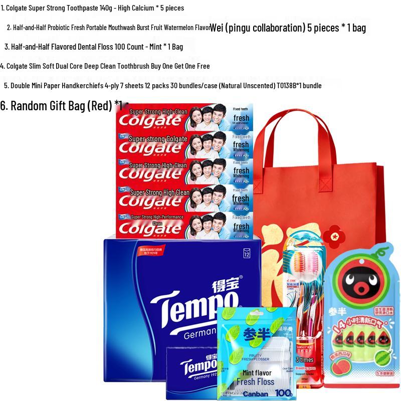 This Colgate Five Calcium Ice Burst Oral Care Gift Set offers a complete oral hygiene solution, including toothpaste, mouthwash, dental floss, a toothbrush, and paper towels, all designed for strong and refreshing oral care.