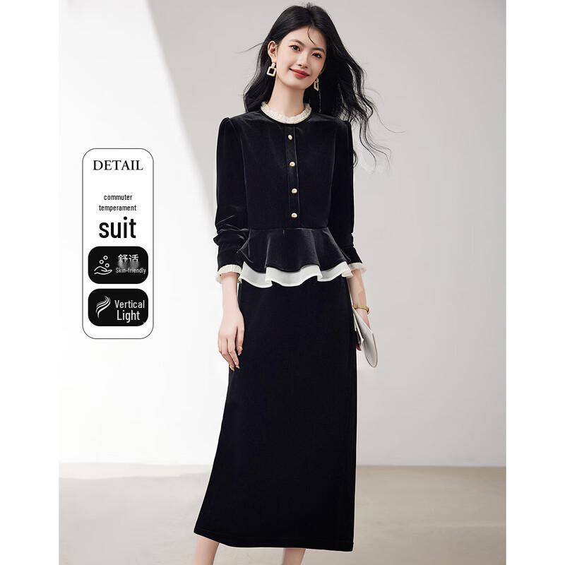 Elegant Women's Long-Sleeve Top and Mid-Length Skirt Set