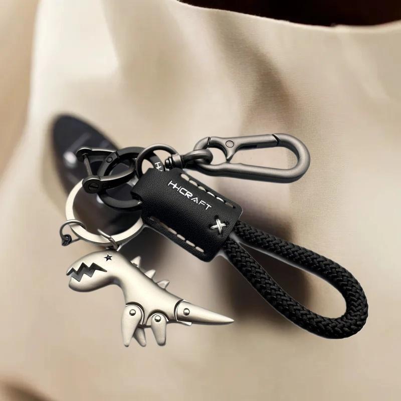 Car Keychain with Little Dino Accent, Single Braided Leather Rope, Metal Key Holder, Motorcycle & Bag Add-Ons