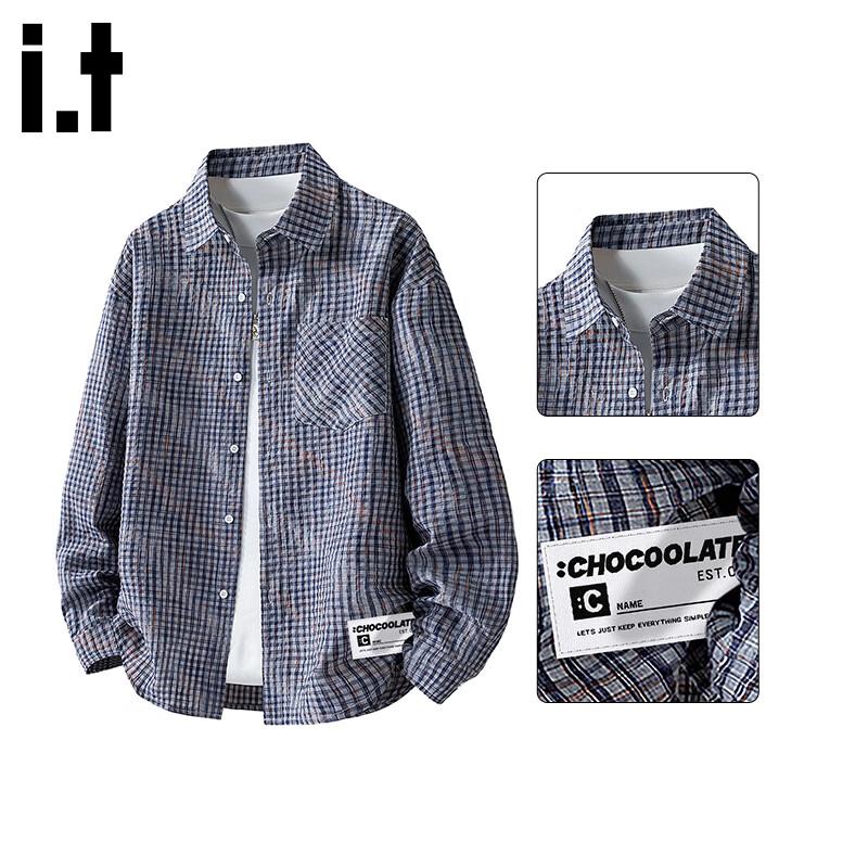 :CHOCOOLATE Men's Seersucker Plaid Long Sleeve Shirt