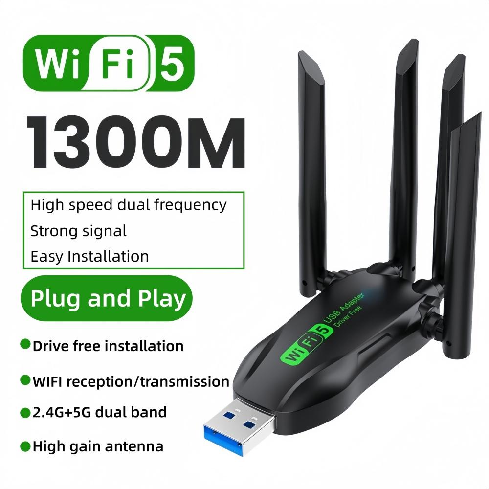 Dual Band 1300Mbps USB Adapter WiFi5 2.4G/5G 4 External Antenna Drive Free USB3.0 Wireless Receiver for Laptops/Desktops