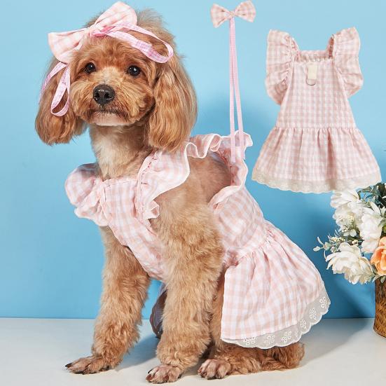 Yousheng Summer Dog Clothes Bow Headdress Ruffled Sleeve Lace Hem Pullover Elegant Dressing-Up Soft Plaid Dress Pet Cat Two-legged Clothes Puppy