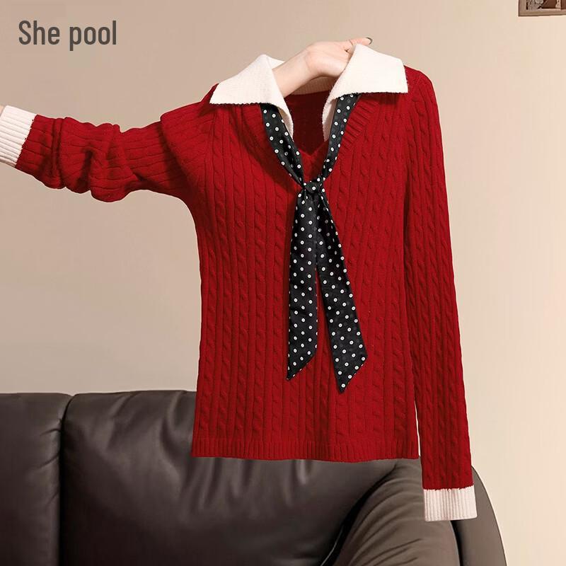 Women's Color Block Lapel Twisted Knit Slim Sweater