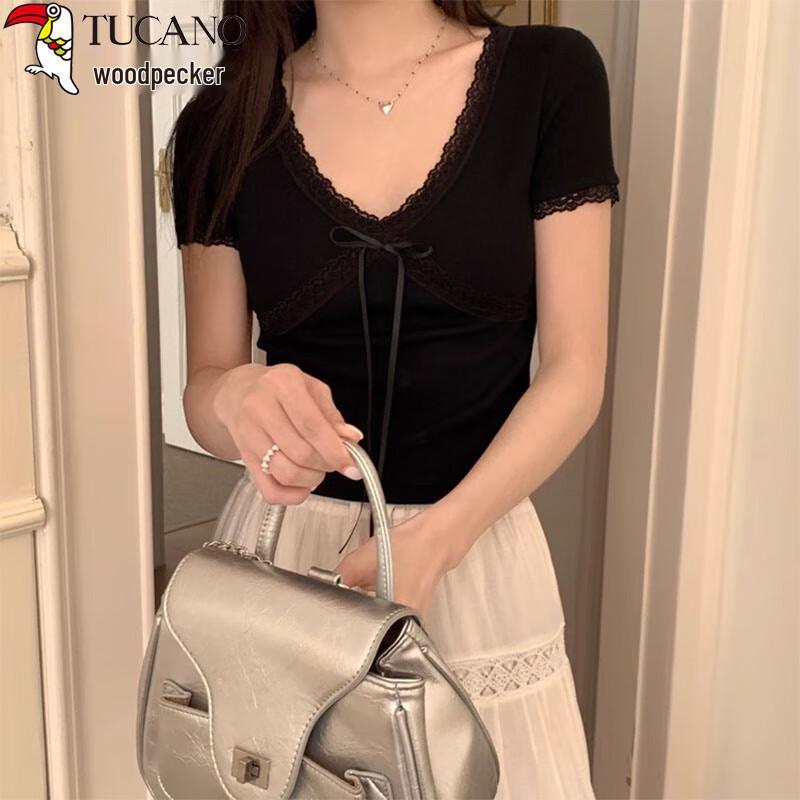 Woodpecker Women's Lace Trim V-Neck Short Sleeve T-Shirt with Bow