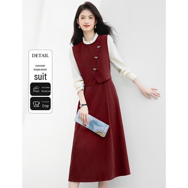 Elegant Burgundy Faux Two-Piece Midi Dress