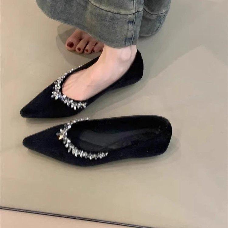 Pointed temperament rhinestone black single shoes, new autumn French red light mouth soft sole evening shoes