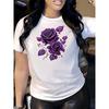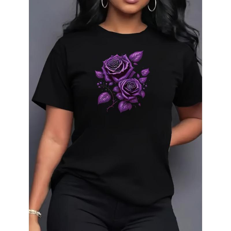 Womens Elegant Purple Rose Print Tee Round Neck Short Sleeve Soft Polyester Blend Lightweight Breathable Spring Summer Sports Casual Top