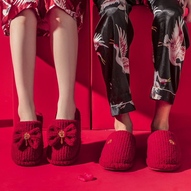 Wedding big red cotton slippers wedding a pair of festive natal year couple tiger bride morning robe autumn and winter