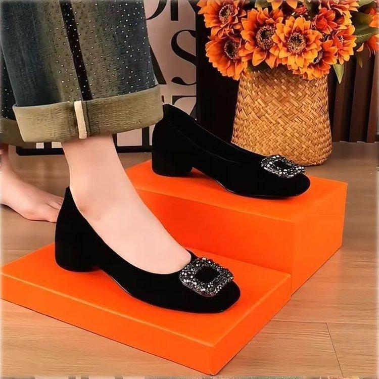 Low-heeled casual single shoes New autumn black square-headed rhinestone shallow mouth temperament thick-heeled commuter shoes
