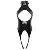 Womens Wet Look Patent Leather Bodysuit Mock Neck Sleeveless Cut Out Crotchless Catsuit Jumpsuit