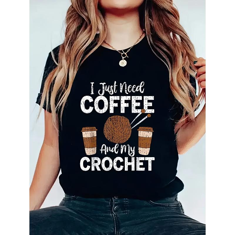 European Size Womens I Just Need Coffee & My Crochet Graphic T Shirt Black White Print 100% Polyester Casual Crew Neck Short Sleeve Top Spring