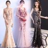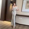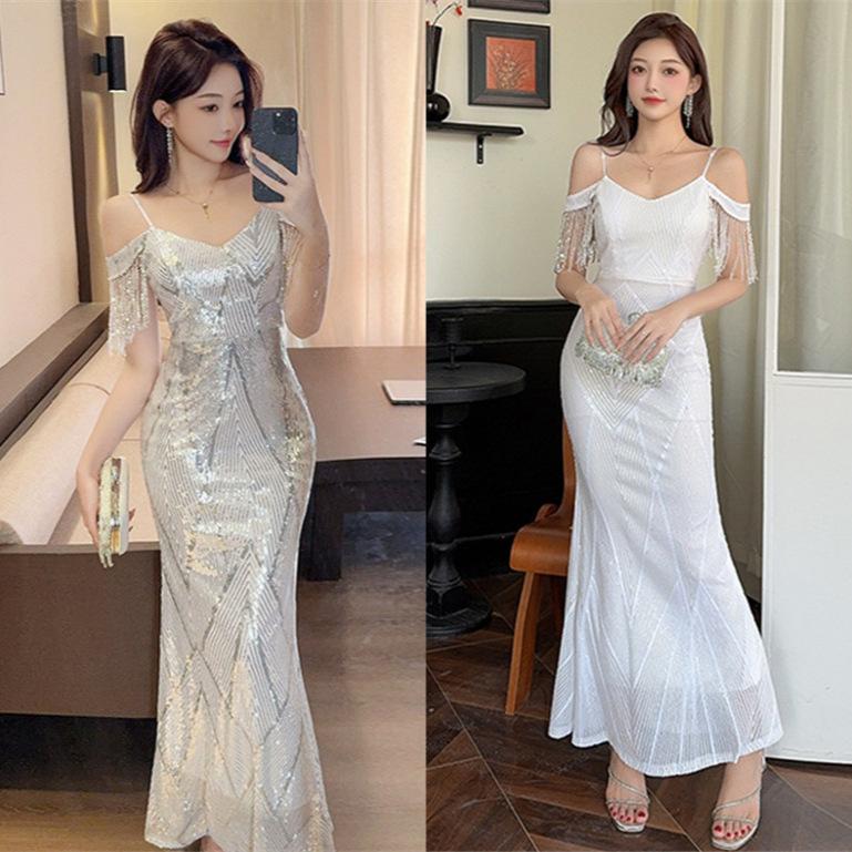 New banquet host evening dress suspender sexy off-the-shoulder dress sequined temperament fishtail dress