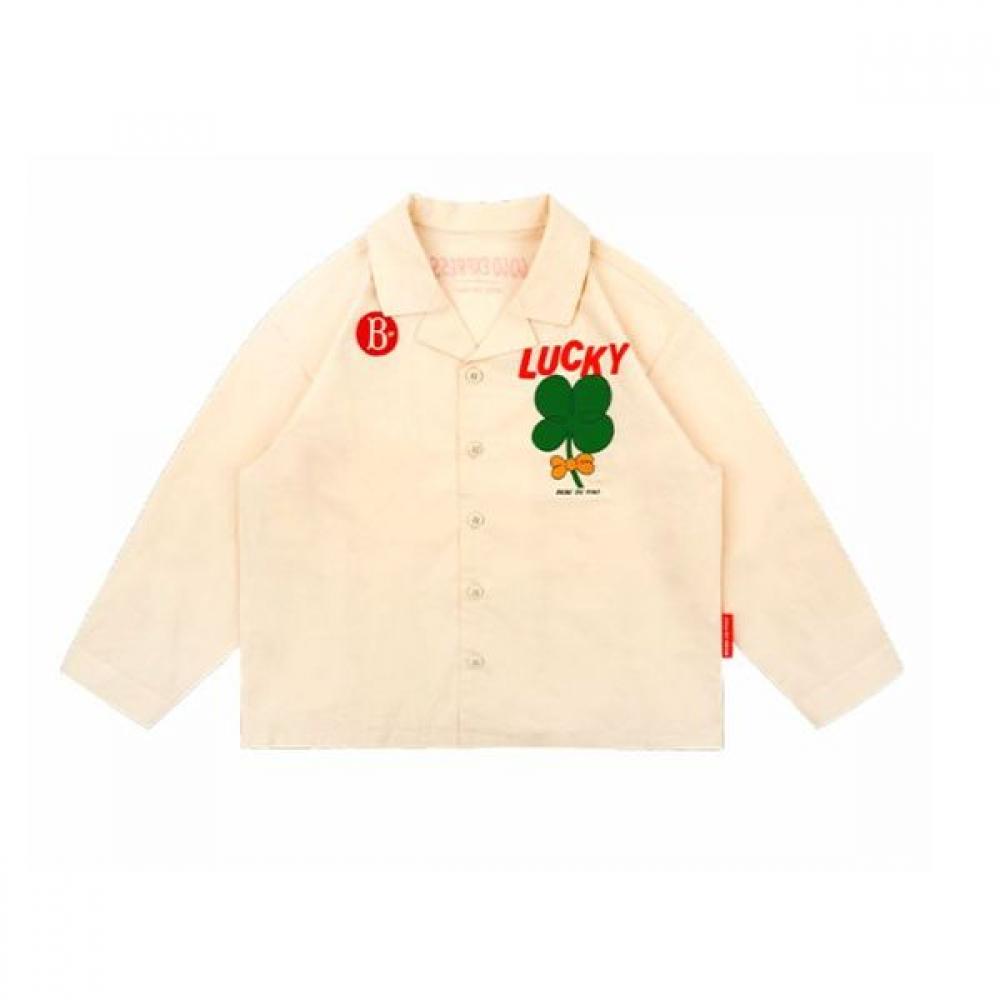 Bebed Pinot Lucky Clover woven collar shirt. This season's unique Lucky Clover graphic unique to Bebed Pinot was printed on cotton fabric in a calm Beige color. This item has an overall relaxed silhouette and is accented with a crease detail on the sleeve chin. The front center has a full slit and then has a button closure, making it easy for children to put on and take off.