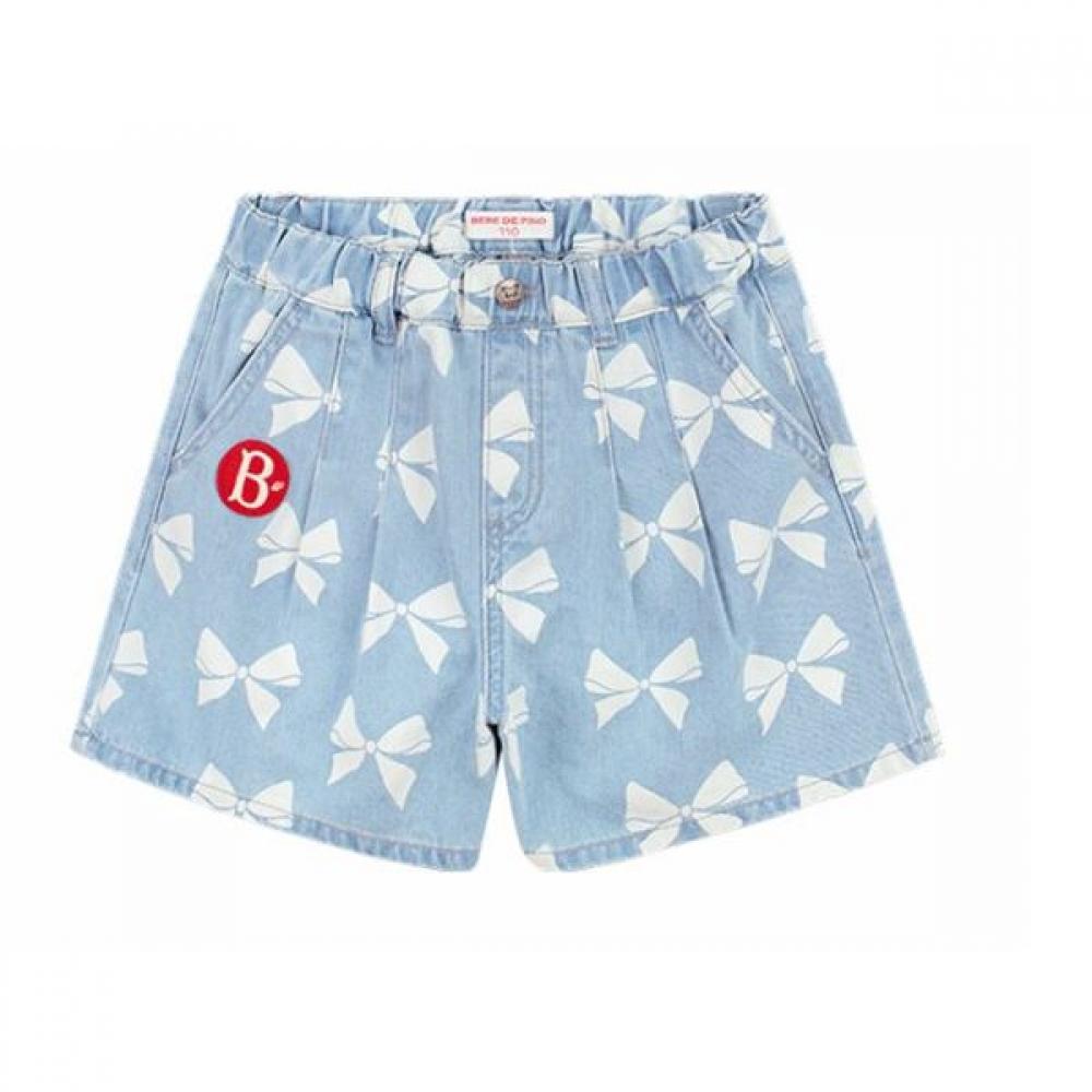Bebed Pinot All Over Ribbon Denim Culottes The ribbon object was printed on a front panel in a light denim color. These culotte pants have an overall relaxed fit by holding the chin below the waist. The entire waist is banded to make it comfortable for children to wear and do activities.