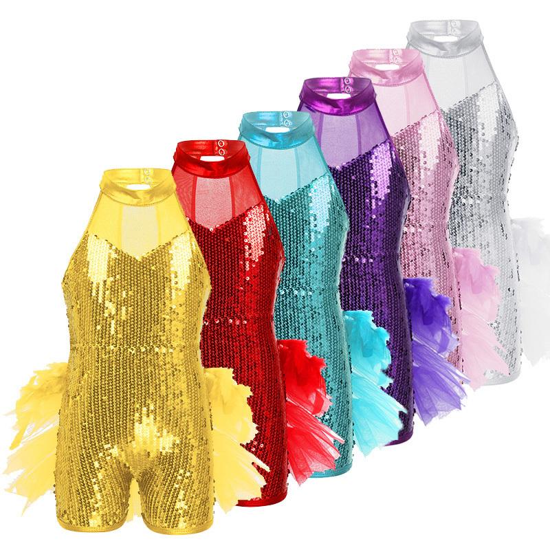Çocuk Kız Caz Latin Sahne Kostümü Payetli Yüksek Yaka Şortlu Tulum Katmanlı Tütü Etekler