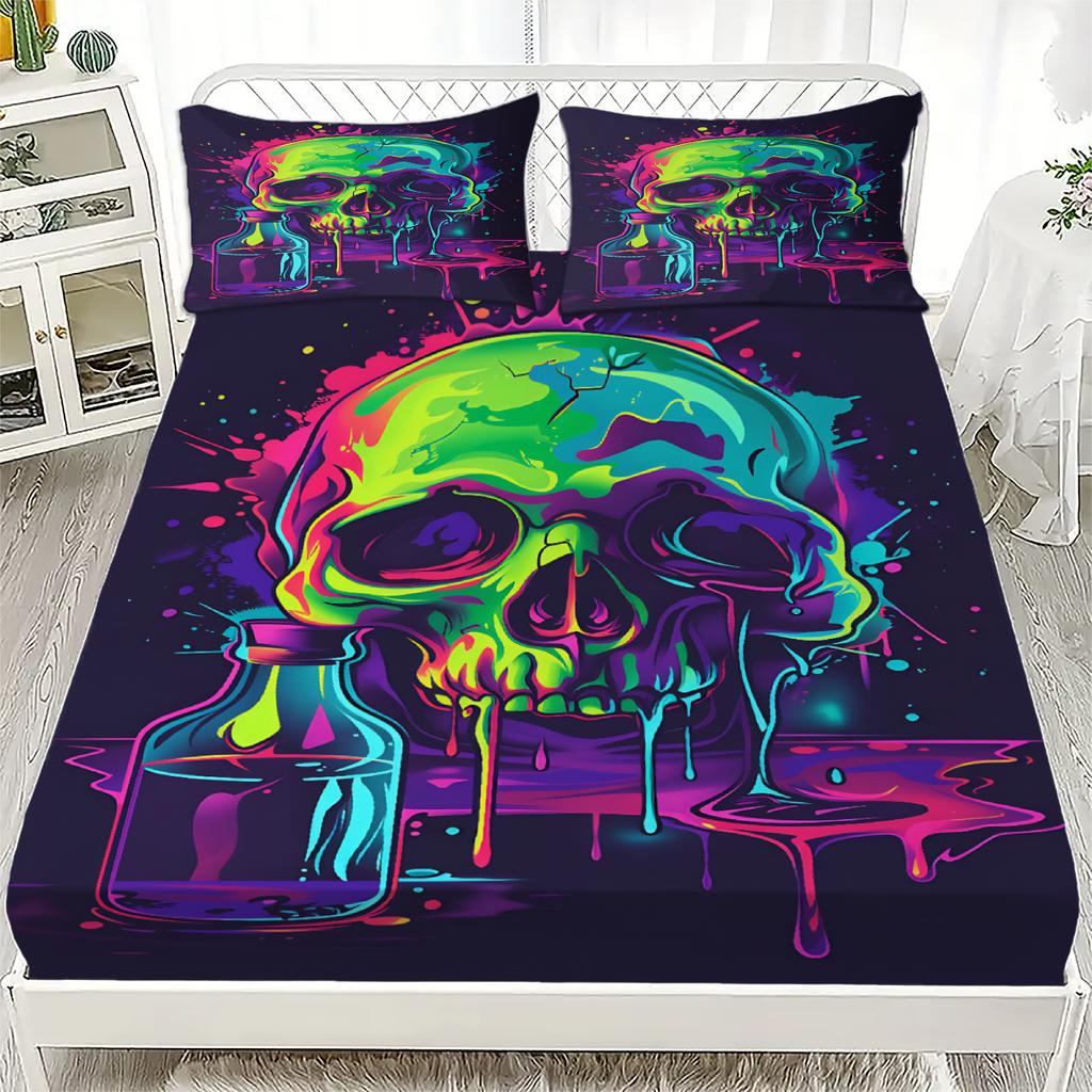 3pcs Fitted Sheet Set Skull 3D Printed Colorful Drip Paint Breathable Easy Care Bed Sheet With Pillowcases For Bedroom Decor