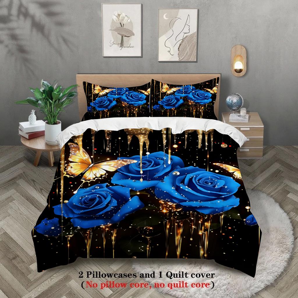 Royal Blue Rose And Butterfly Bedding Set Black Background With Gold Accents