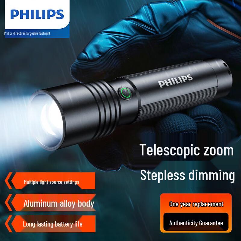 The Philips SFL2146 is a powerful and versatile flashlight featuring a zoomable beam and convenient Type-C rechargeable design. Constructed from durable aluminum alloy and rated IP44 waterproof, it delivers 500-1000 lumens of bright light for various scenarios including outdoor activities, cycling, home use, and emergencies. Its built-in 18650 battery provides reliable illumination for up to 5 hours.