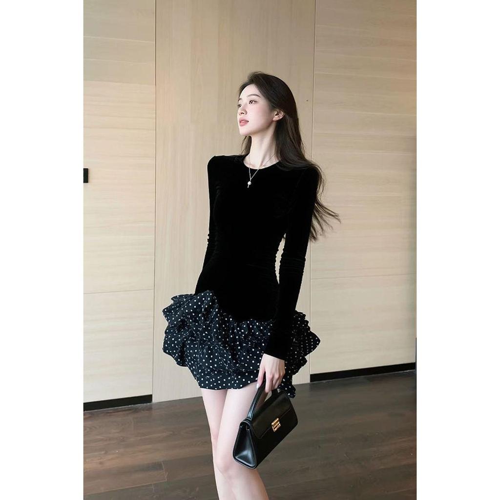 2025 Autumn Black Velvet Polka Dot Slim-Fit Round Neck Dress
