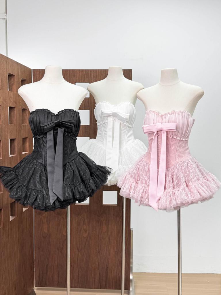 Vietnamese Sweet Bandeau Lace Bow Patchwork A-line Dress