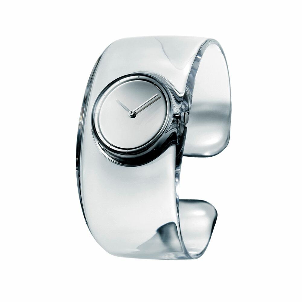 The Shape of Water. A Transparent Timepiece "O" (from the French word for water, "eau") Based on the concept of "The Shape of Water. A Transparent Timepiece," the "O" series is crafted using transparent materials, a specialty of Yoshioka, for a shapeless watch like water, with an instantaneous sparkle like light. Weighing just 25g, this lightweight bangle-style watch can be worn like an accessory.