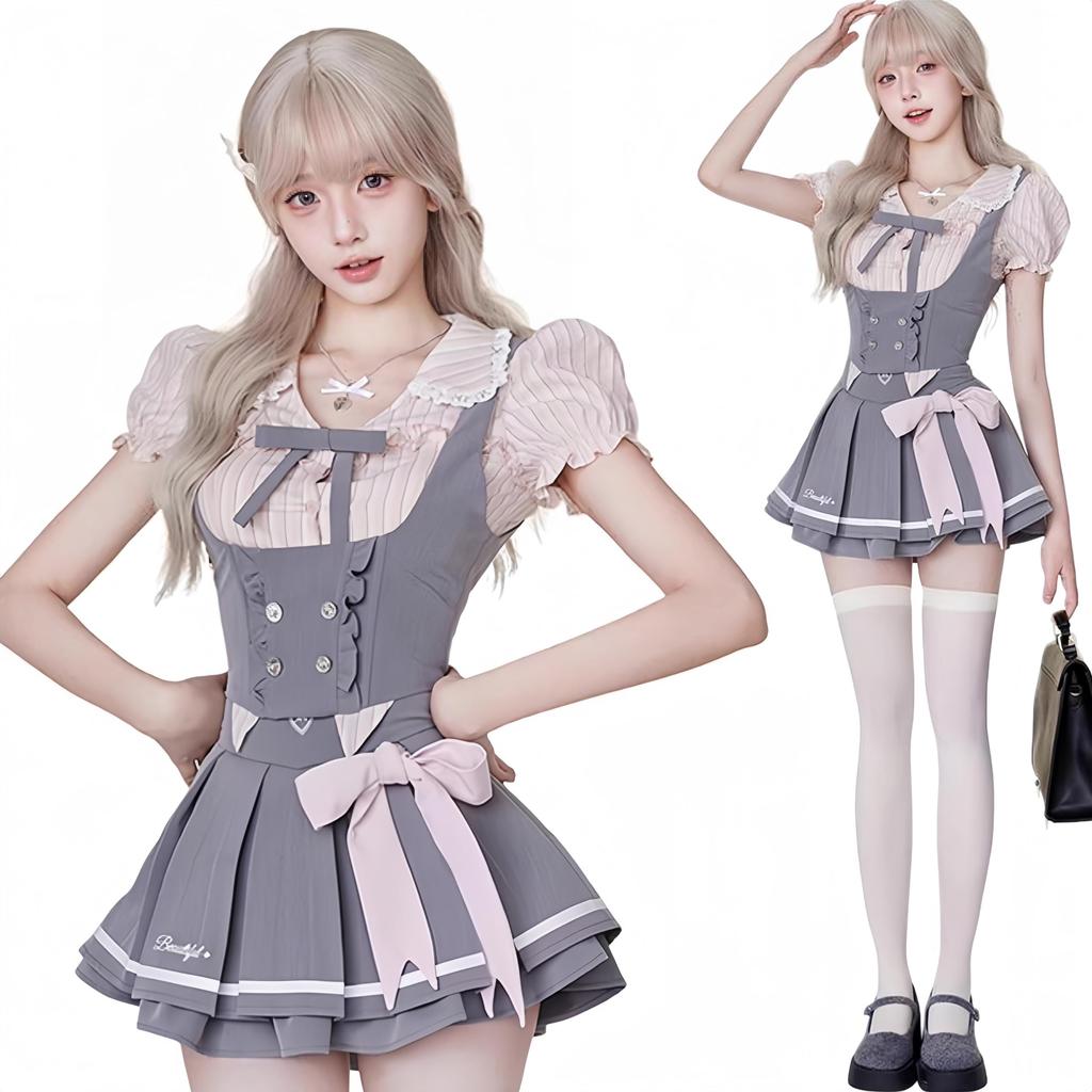 Ligwon Gothic Lolita JK Uniform Set with Mini Pink and Harajuku Korean Christmas Women's Skirt, Gray, Style, Style, Spring, Summer, Autumn, Halloween,