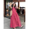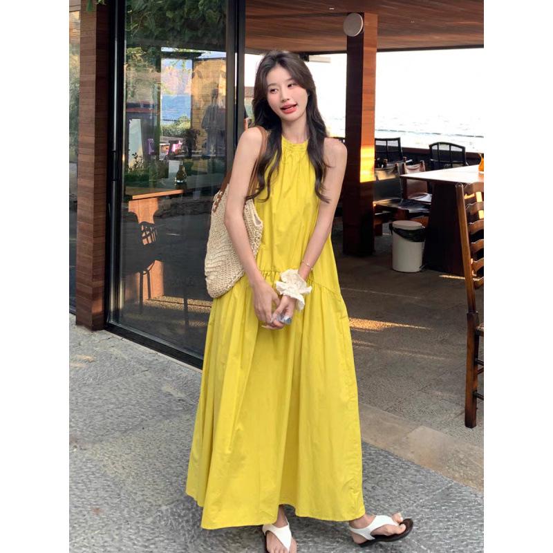 Elegant Yellow Sleeveless Halter Neck A-line Dress - Women's Retro Resort Style.