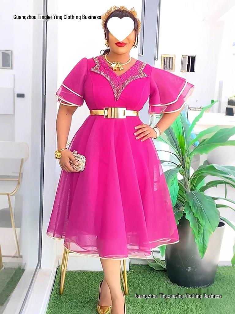 This elegant bodycon dress is designed specifically for plus-size women, offering a flattering V-neckline that enhances the silhouette. Crafted from high-quality polyester material, the dress ensures both comfort and style. The knitted fabrics provide a soft and durable texture, while the standout feature is a beautifully beaded belt that adds a touch of sophistication and cultural charm. Perfect for various occasions, this dress seamlessly combines contemporary fashion with traditional African influences.