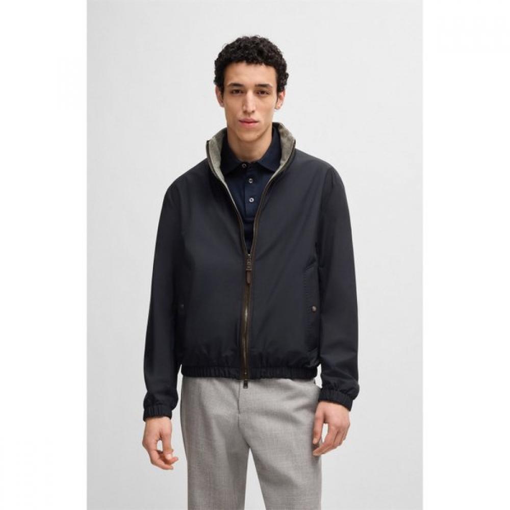 The Peach Fabric Reversible Zip-Up Jacket is a reversible jacket from BOSS Menswear, enhanced with lightweight insulation. Featuring a central front double zipper for opening and closing, one side is made of soft fabric while the other side utilizes stretchy material. Press stud pockets complete the timeless design.