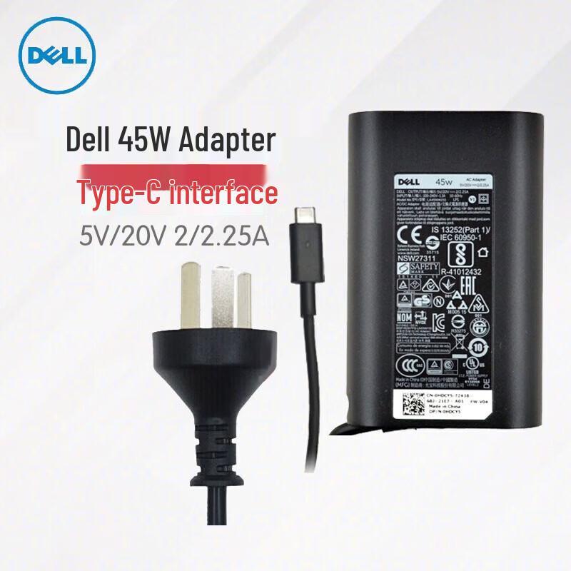 Original Dell Type-C PD fast charging power adapter for laptops. Features 45W output (5V-20V, 2/2.25A) and comes with a power cord. Ideal for thin and light notebooks.