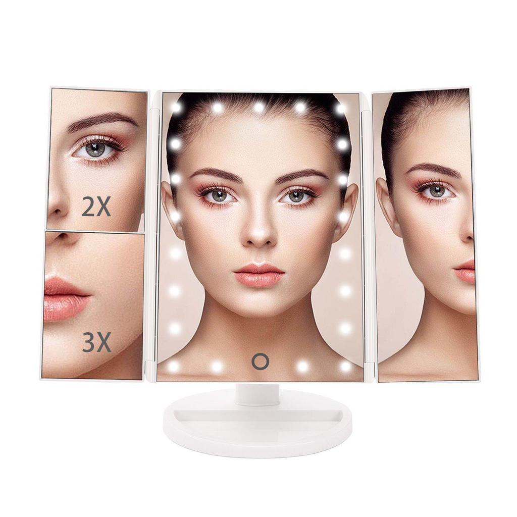 LED Desktop Folding Vanity Mirror with 2X/3X Magnification, Dual Power, Touch Dimming, Tri-Fold Design