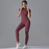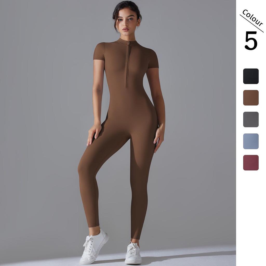 Solid Color Zipper High-Stretch Bodysuit with Short Sleeves and Full-Length Nine-Point Pants for Fitness and Yoga.