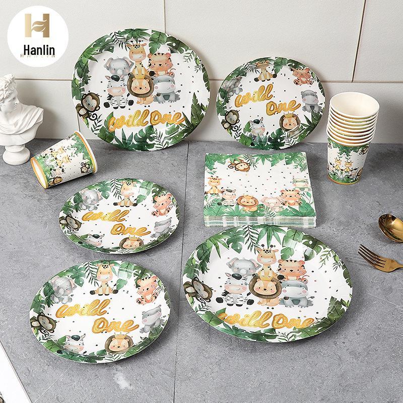 Jungle Animals Disposable Tableware Set: Napkins, Plates, and Cups for High-End Restaurants and Hotels (4-Piece).