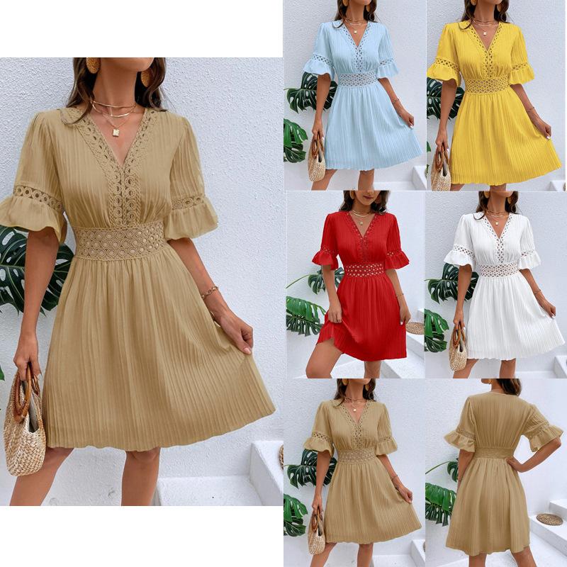 Women's summer new splicing lace fashion V-neck waist solid color dress