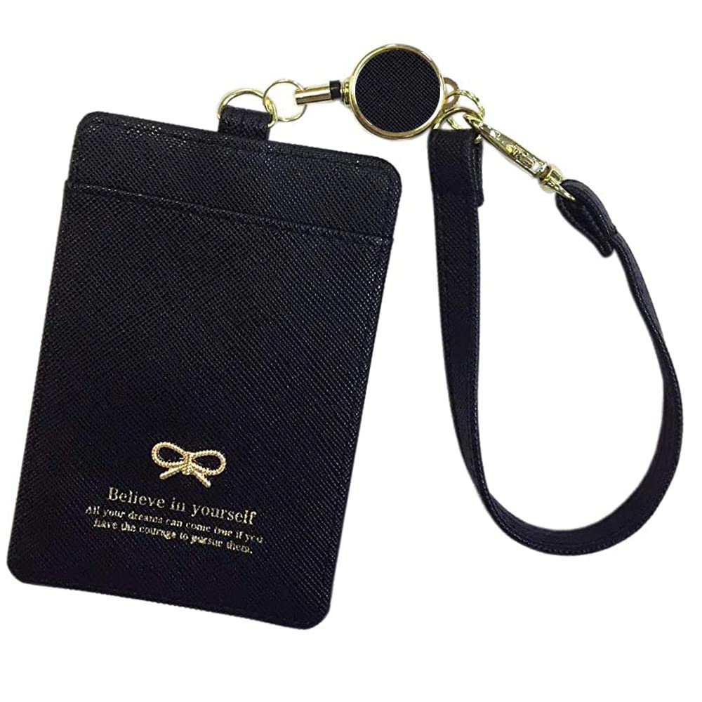 Extendable Reel Pass Case, Card Holder, Initials, Personalized ID Card Case, with Strap, Smiley Face, Ribbon Design (Black [Fabric Design (Same
