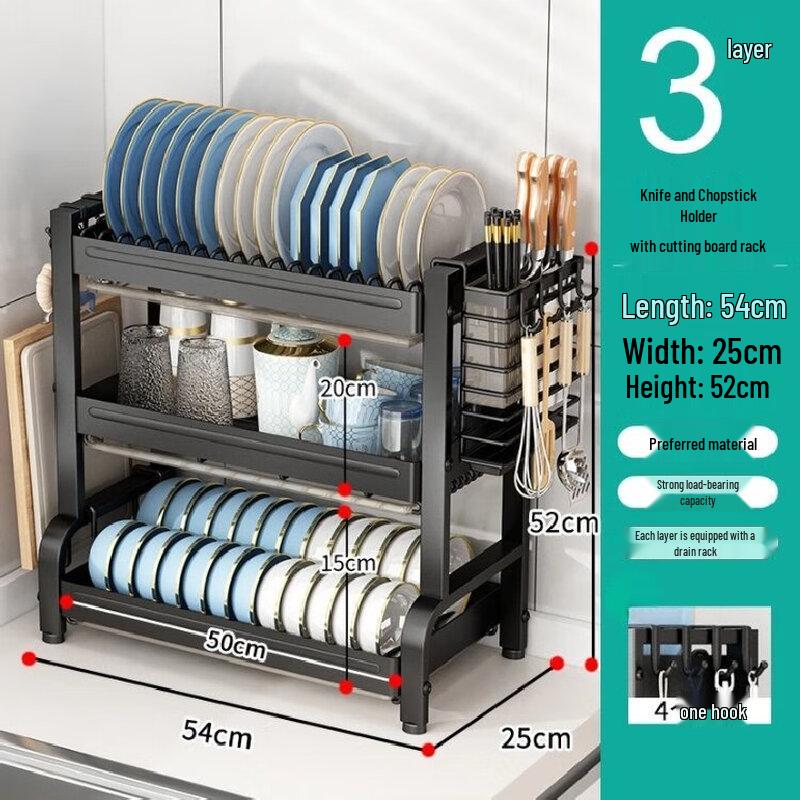 Three-Layer Black Countertop Dish Drainer Rack with Utensil Holders