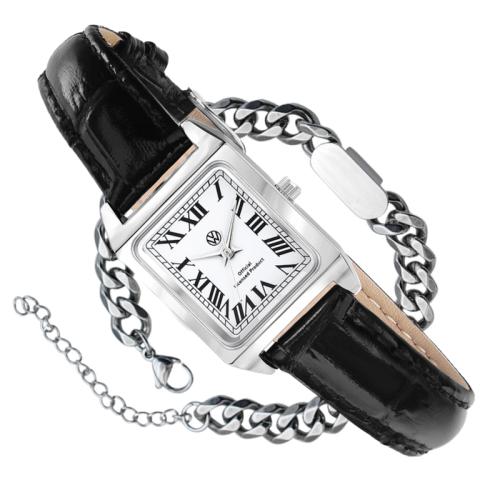 ⌚ OverviewThis exquisite set from Volkswagen Watch pairs a classic timepiece with a contemporary accessory. It features a retro-inspired square watch with elegant Roman numerals, perfectly complemented by a sleek titanium bracelet. This duo offers a sophisticated statement for the modern woman, blending timeless design with durable, high-quality materials, making it an ideal choice for both daily wear and special occasions.