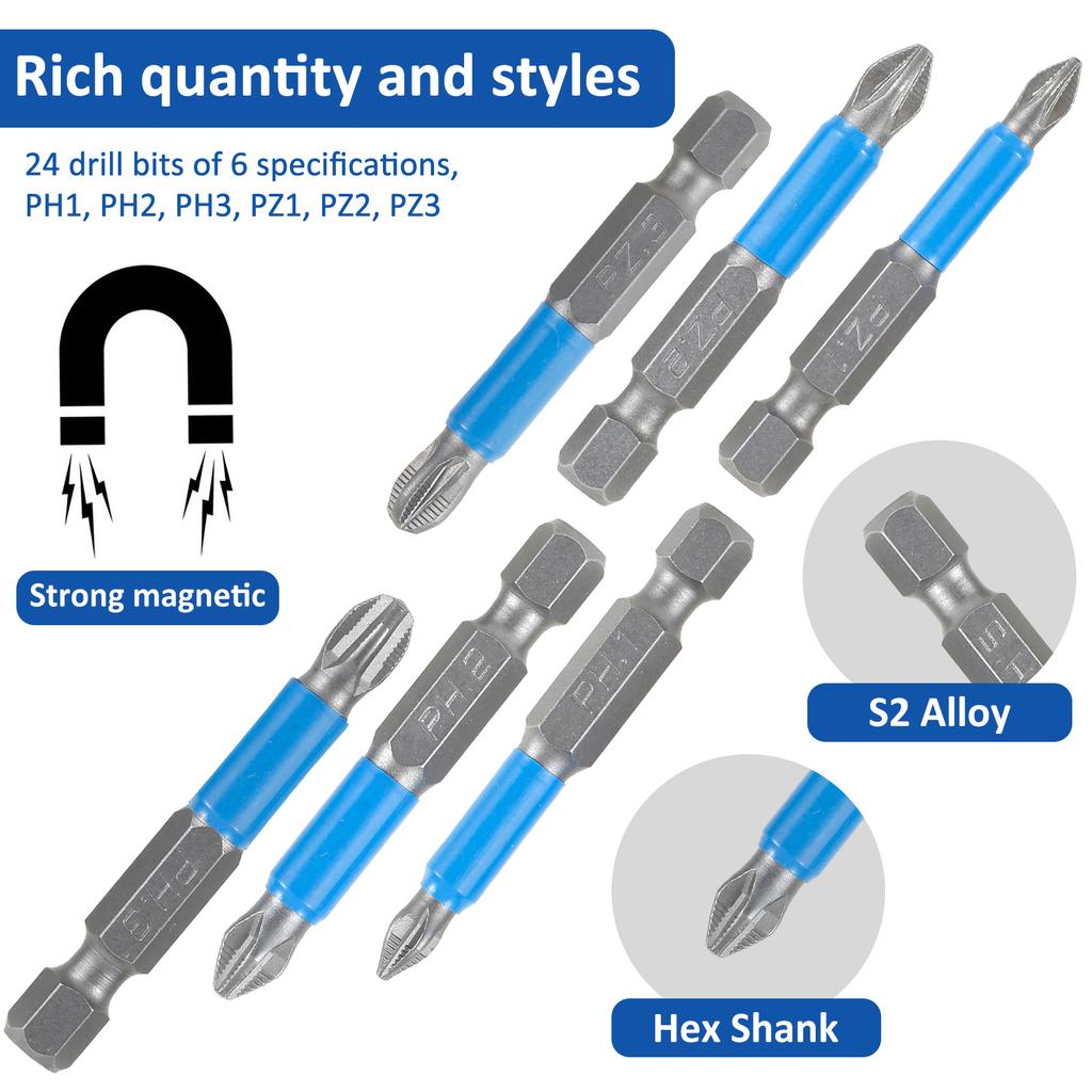 24Pcs Cross Head Screwdriver Bits 1/4 Inch Hex Shank Cross Slot Impact Driver Bit Set PH1 PH2 PH3 PZ3 Electric Screwdriver Tool