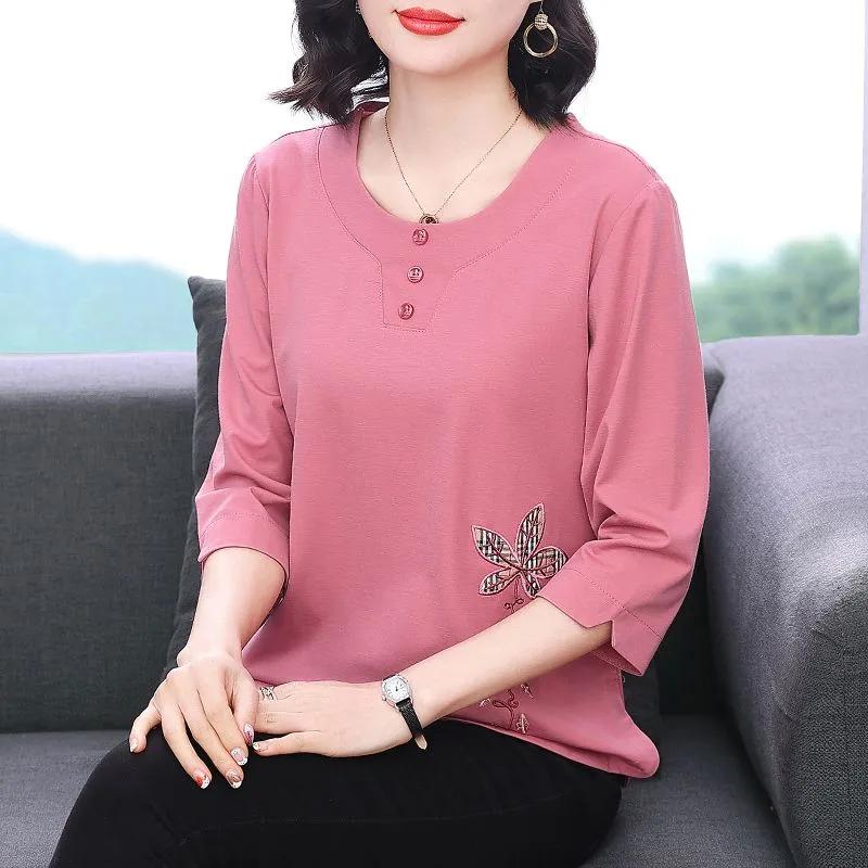 Summer Round Neck Embroidered Three-quarter T-shirt for Middle-aged Elderly People New Loose Mother Tops for Women