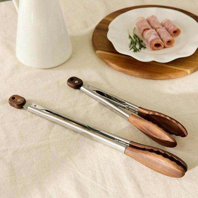 Stainless Steel Food Clip Walnut Wooden Handle Multifunctional Heat-Resistant Tongs Anti-Scald Kitchen Tool for Grilling Frying
