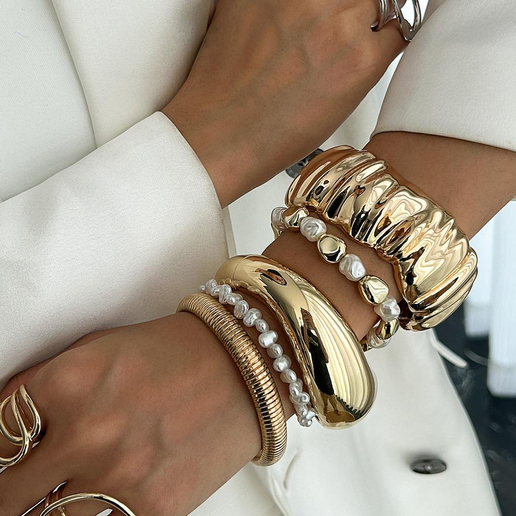Wind Stacked Wear Temperament Imitation Pearl Bracelet Women, Fashion Metal Wide Folded Bracelet Bracelet
