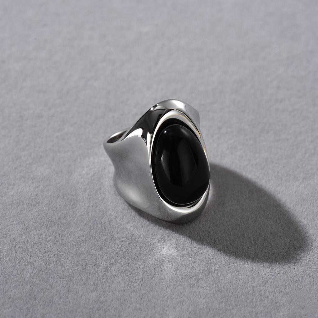 Niche High-End Cold Wind Irregular Copper Plated Platinum Inlaid Black Agate Ring, Unique Personality Trend Ring