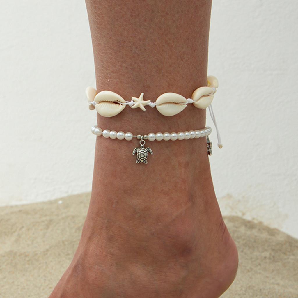 Beach Vacation Starfish Shell Turtle Anklet Set, Ocean Style Imitation Pearl Beaded Feet