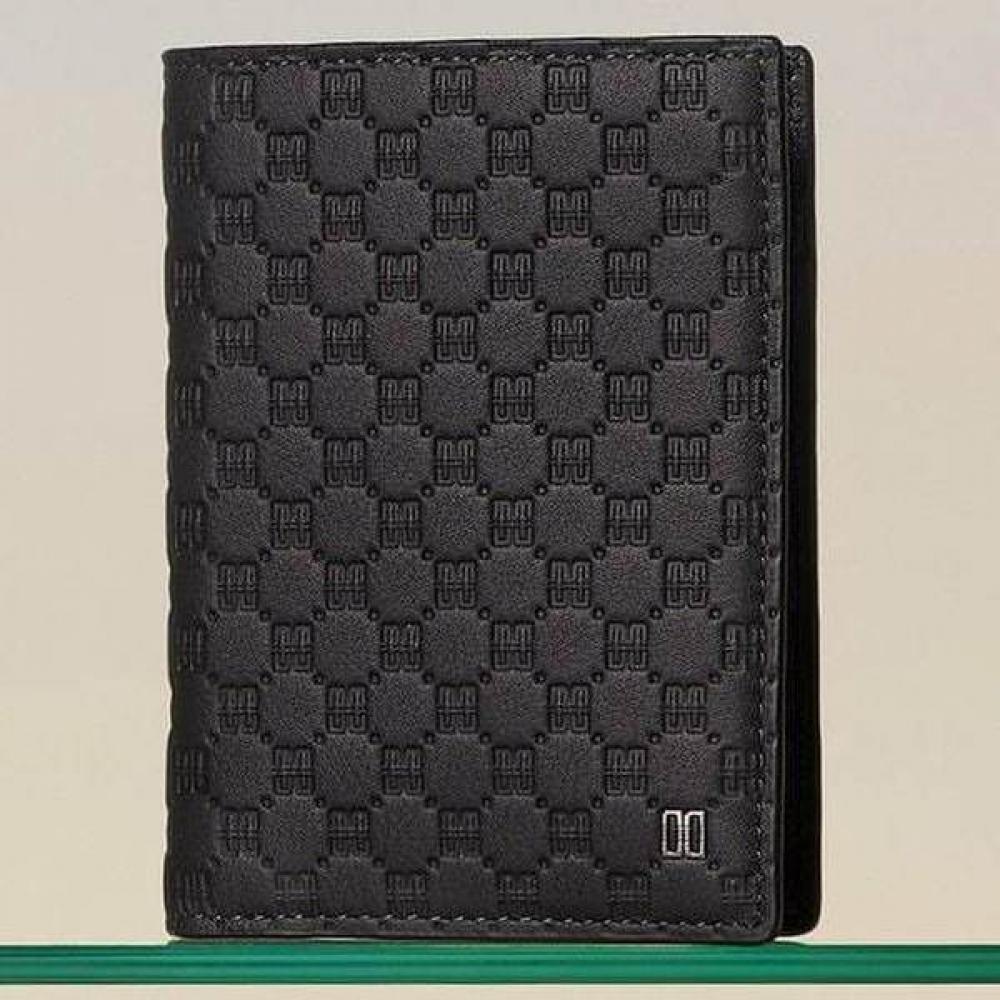 Product name: DBWA6E375BK (Bill Holder) [LOUIS] Black European Imported Leather Embossed DD Pattern Card Organizer. This product is crafted from cowhide, providing a luxurious touch and is a minimal slim wallet with a simple design. The embossed DD logo pattern enhances its sophisticated appearance. This wallet is practical with a central card compartment, side bill pocket, film pocket, and sub pocket.