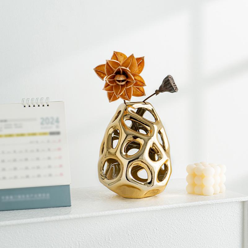 Electroplating Gold Hollow Ceramic Vase Delicate Flower Arrangement Container Living Room Countertop Vase Crafts Home Decoration